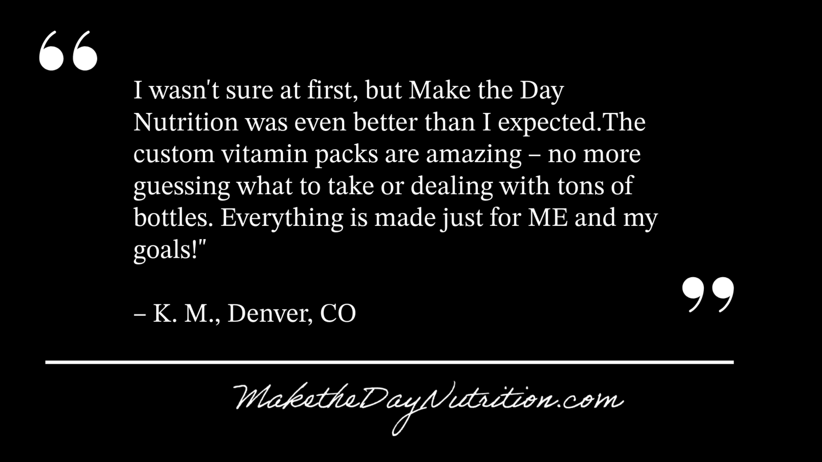 At Make the Day Nutrition, we believe your nutrition should be as personalized as your medical care. That's why we offer a custom supplement program from Persona Nutrition-developed with your provider to align with your treatment plan, address specific nutrient needs, and support clinical outcomes